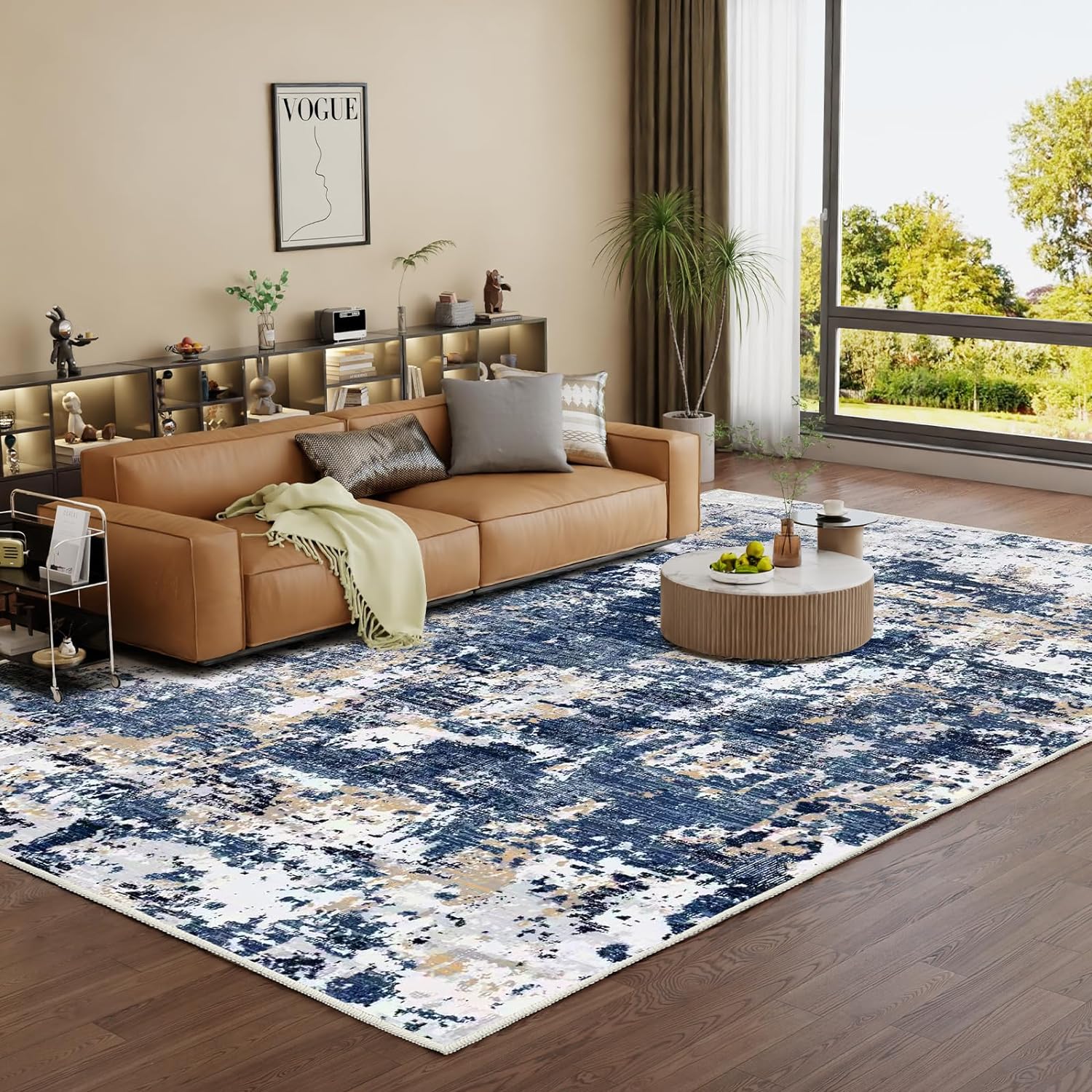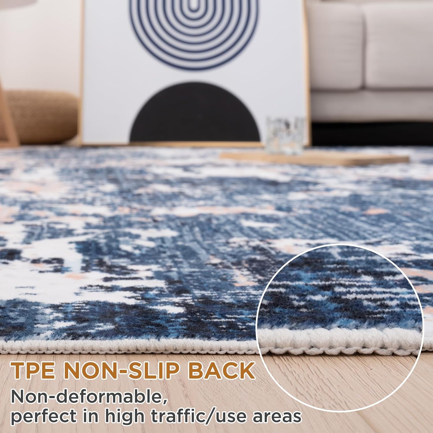Deep Blue Washable Abstract Area Rug - Contemporary Style for Living Room